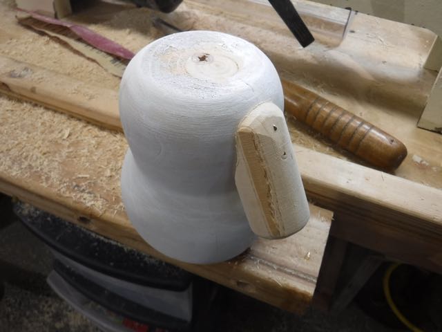 Tuesday was spent working on the snow lady. I decided she needed arms which meant two pieces of 2x2 milled pine had to be turned round then each carved to fit the body.
